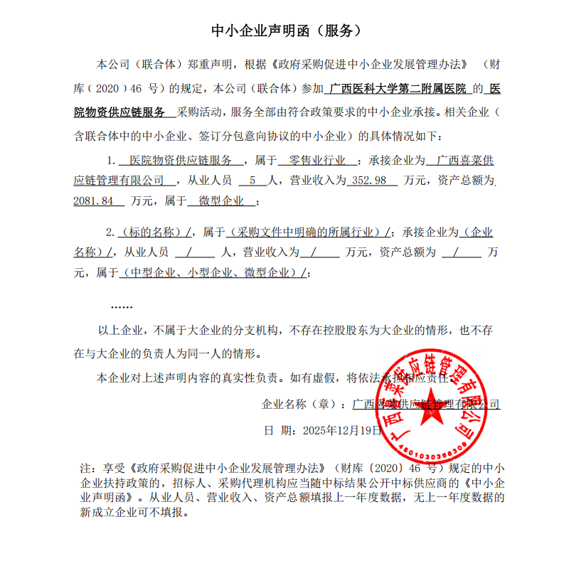 | 1 | 医院物资供应链服务 | 医院物资供应链服务 | 医院物资供应链服务1项,为招标单位提供清洁用品、办公用品及其他用品等物资。如需进一步了解详细内容,详见招标文件。 | 详见招标文件 | 自合同签订之日起2年。 | 详见招标文件 |