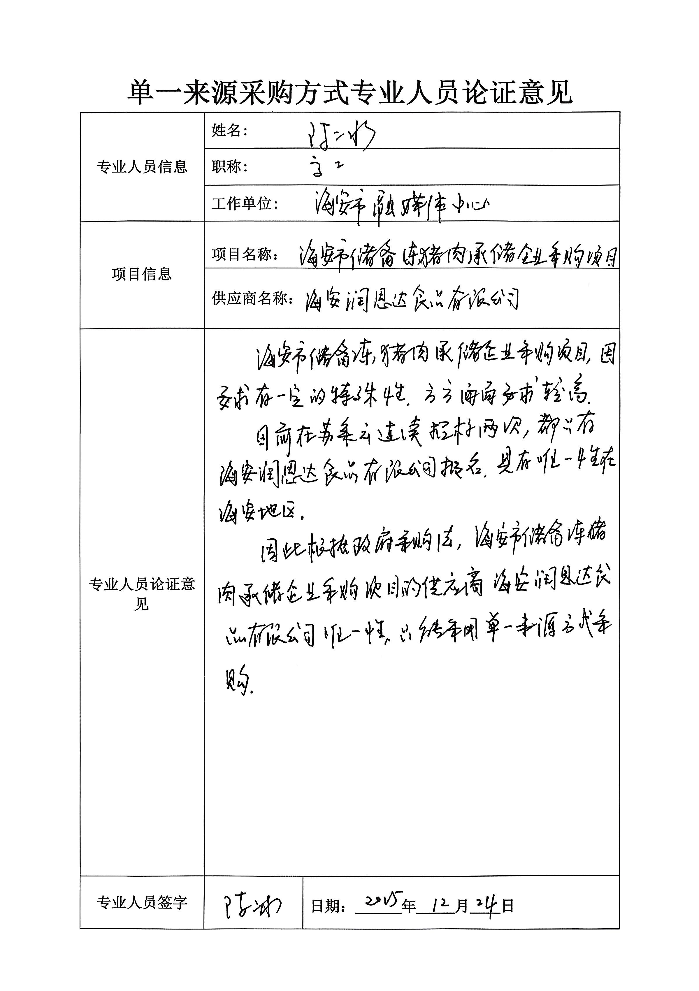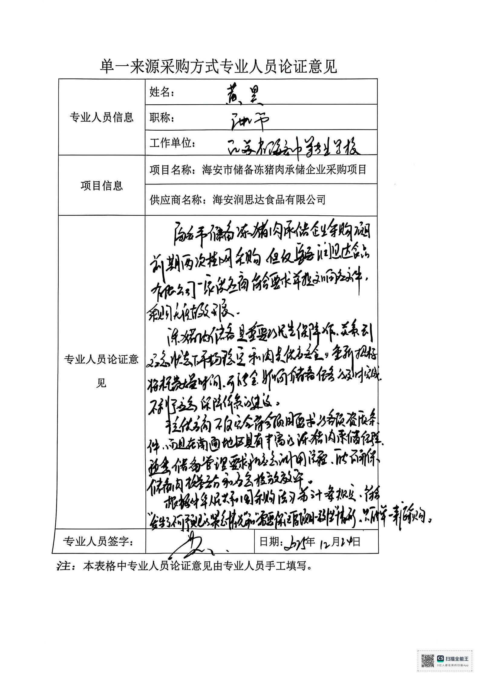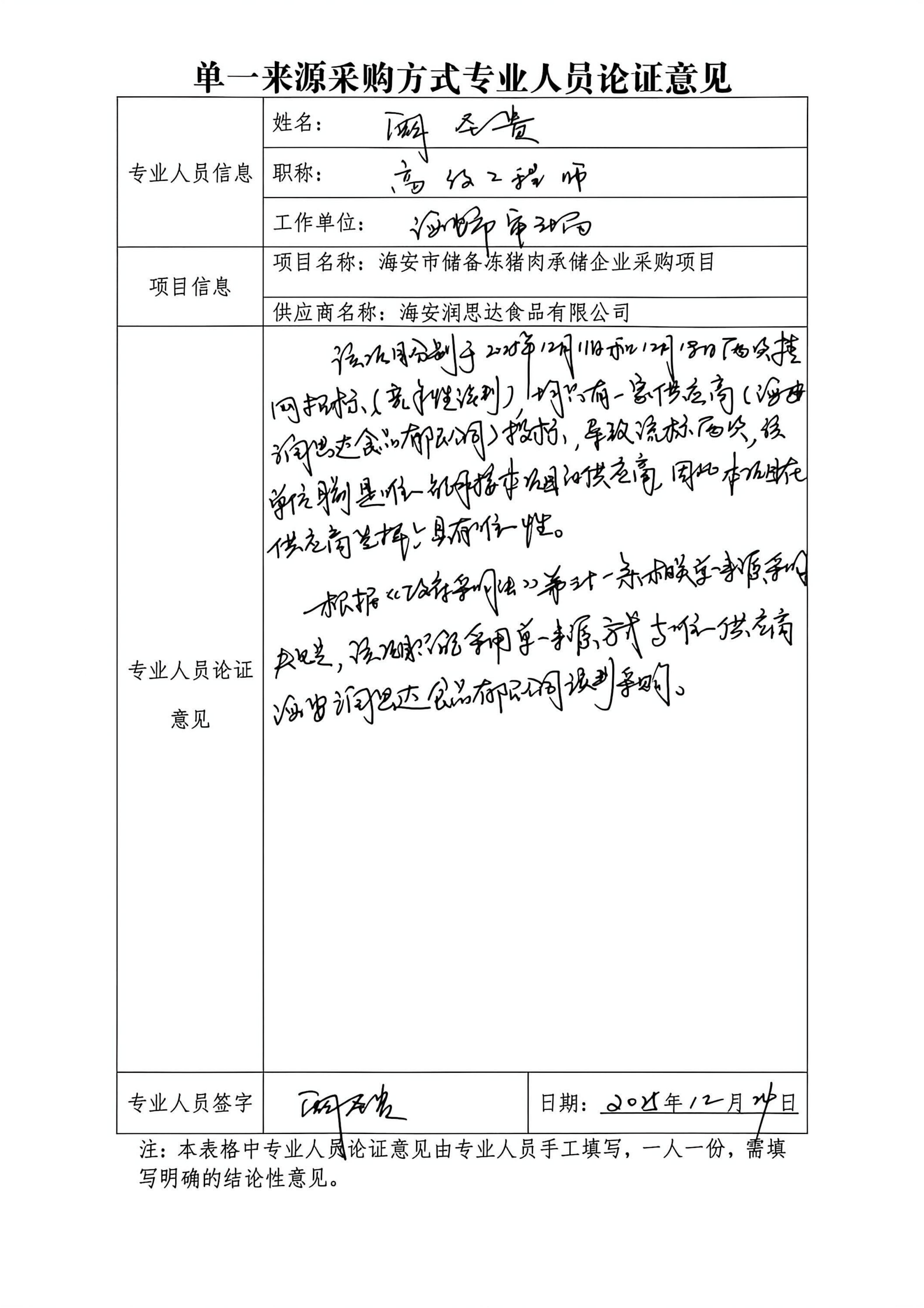 采用单一来源采购方式的原因及相关说明:因海安市储备冻猪肉承储企业采购项目要求有一定的特殊性、要求较高,目前在苏采云连续招标两次,都只有海安润思达食品有限公司报名且该公司在海安地区具有唯一性。因此根据政府采购法,海安市储备冻猪肉承储企业采购项目的供应商海安润思达食品有限公司具有唯一性,只能采用单一来源方式采购。
