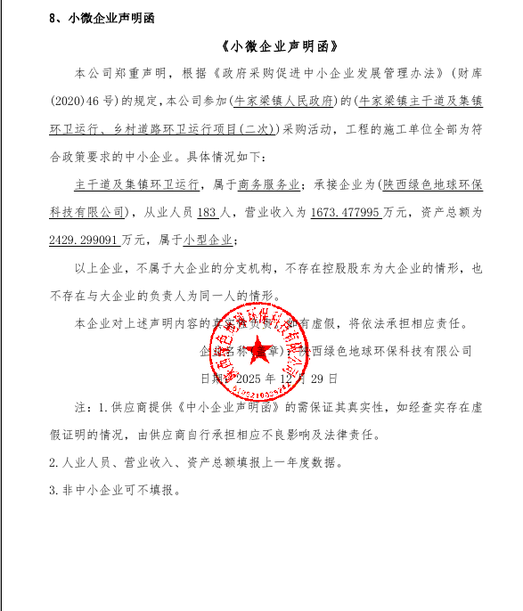 合同包1(牛家梁镇主干道及集镇环卫运行、乡村道路环卫运行项目包1):