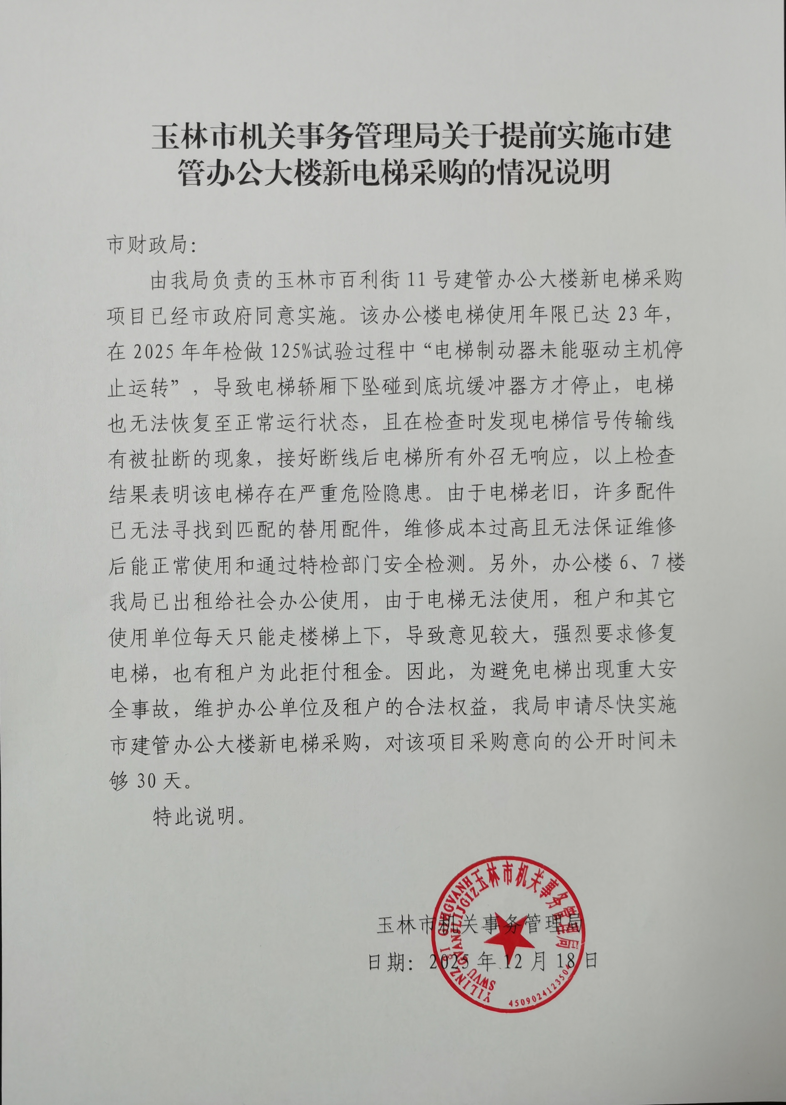 市建管办公大楼(市百利街11号)电梯采购采购项目的潜在供应商应在广西政府采购云平台(https://www.gcy.zfcg.gxzf.gov.cn/)获取采购文件,并于2026年01月06日 09:00(北京时间)前提交响应文件。