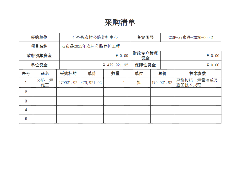 | 1-1 | 公路工程施工 | 479921.92 | 1(批) | 详见采购文件 | 479,921.92 |
