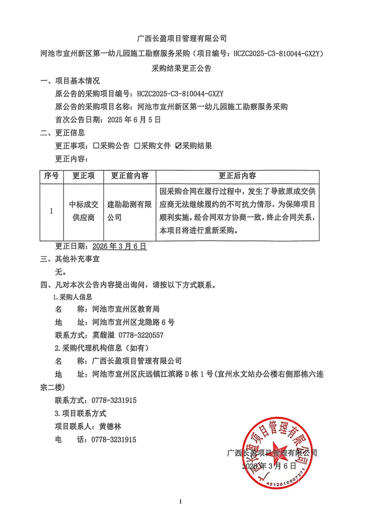 原公告的采购项目名称: 河池市宜州新区第一幼儿园施工勘察服务采购