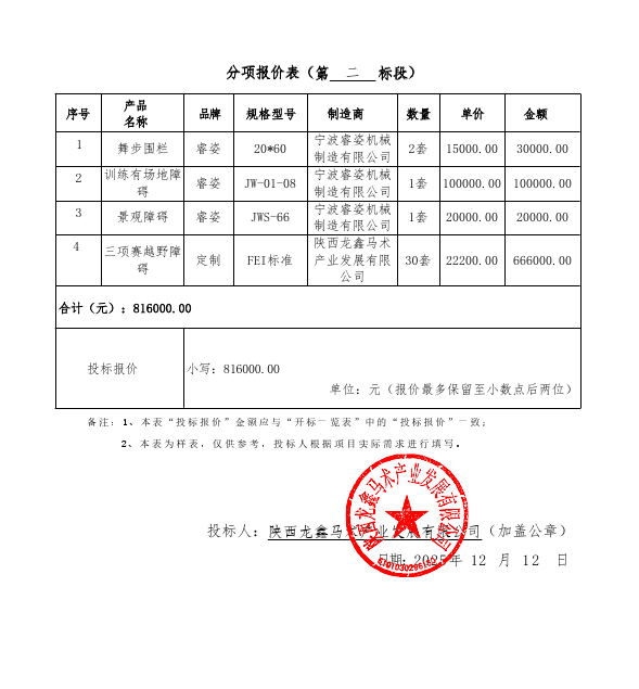 | 2 | 赛马和马术运动设备 | 详见附件 | 详见分项报价表 | 详见分项报价表 | 1.00(批) | 816,000.00 | 816,000.00 |