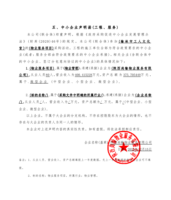 | 1 | 物业管理服务 | 物业服务 | 榆林市工人文化宫 | 按招标文件服务要求 | 1年 | 按招标文件服务标准 | 1,462,000.00 |