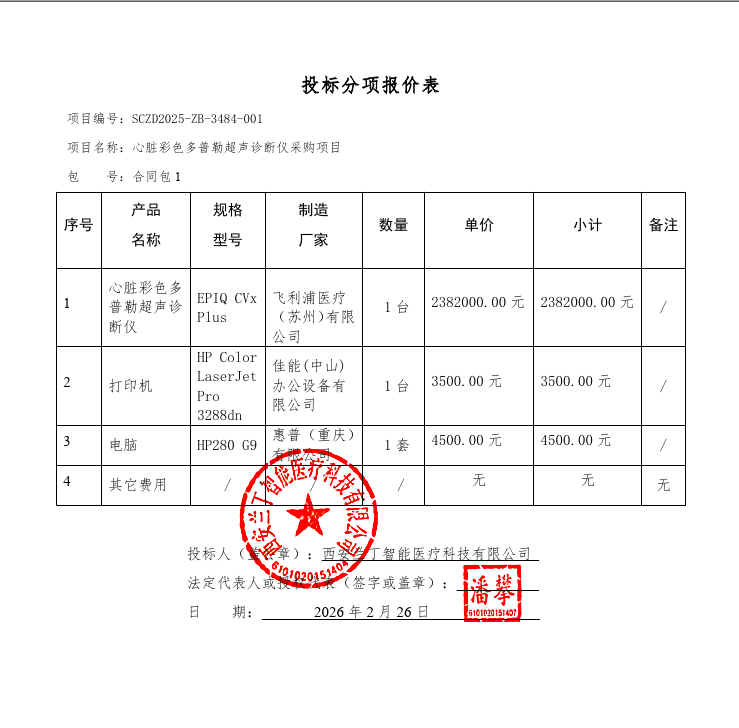 一、项目编号:SCZD2025-ZB-3484-001 二、项目名称:心脏彩色多普勒超声诊断仪采购项目 三、采购结果